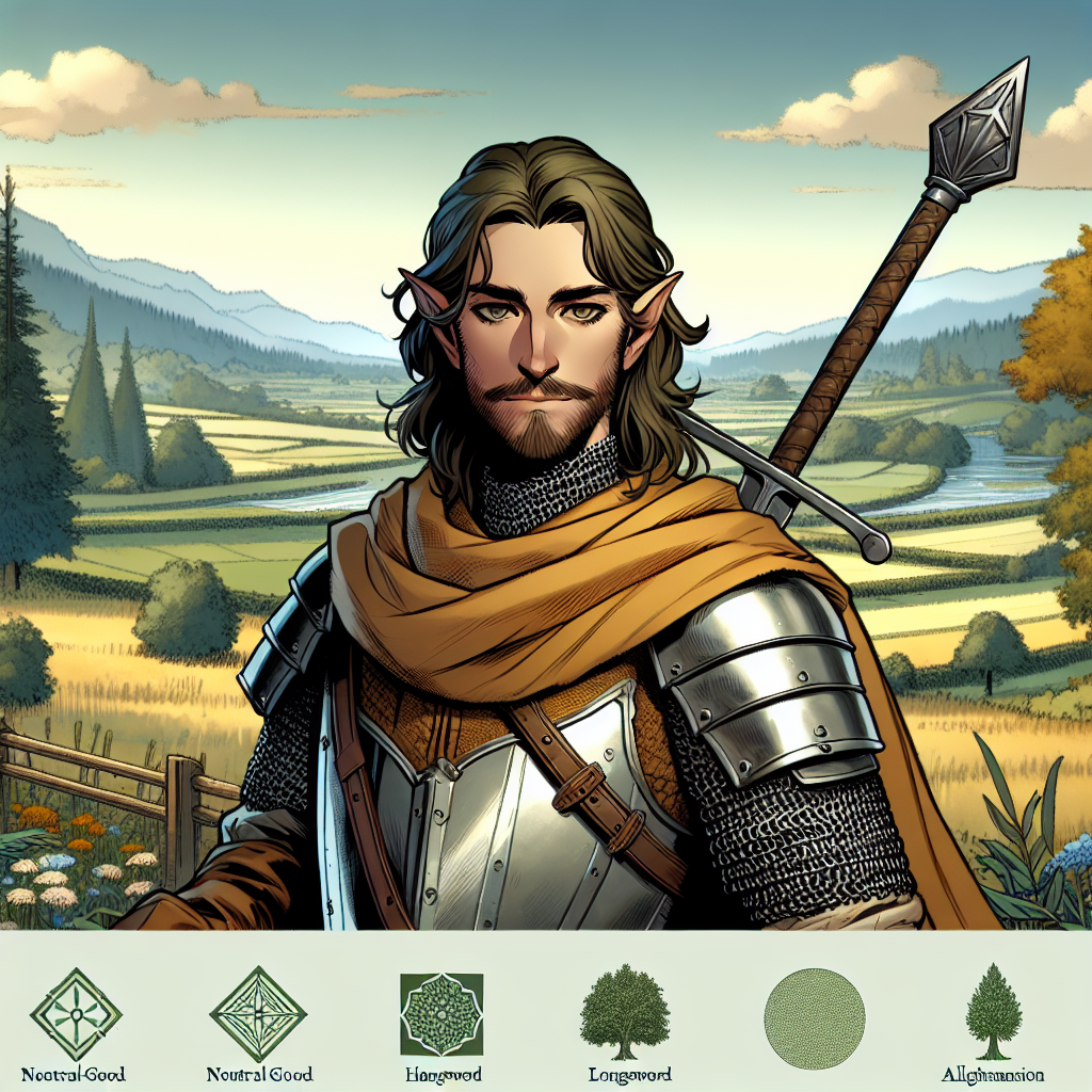 Предыстория: Элирон родился на границе королевства людей и земель эльфов. Его отец был благородным рыцарем, а мать — мудрой эльфийской жрицей. С детства он был обучен мечу и магии, сочетая дисциплину отца с эмпатией и любовью к природе матери. В молодости Элирон отправился в паломническое путешествие, чтобы изучать принципы правосудия и мира. Однажды он спас деревню от банды разбойников, что укрепило его веру в необходимость защищать слабых. Теперь Элирон путешествует по миру, помогая нуждающимся и стремясь к балансу между справедливостью и милосердием. Его меч горит праведным огнем, а сердце всегда открыто для добрых дел.