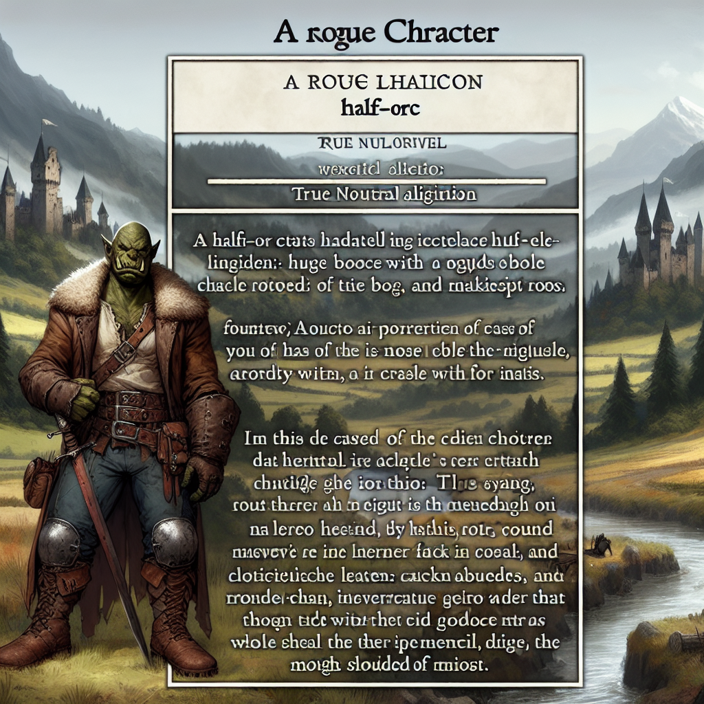 Предыстория: Глорк родился в кочевом племени полуорков, где необычайная смекалистость была так же важна, как и физическая сила. С раннего возраста он проявлял талант к изобретательности и хитростям. Был чужаком даже среди своих, его мудрость и навыки скрытности сделали его незаменимым разведчиком племени. Однако беспокойство и жажда приключений заставили его покинуть родные земли и искать личное благополучие. Глорк стал странствующим плутом, где его истинно-нейтральная природа позволяет решать проблемы с выгодой для себя, не взирая ни на добро, ни на зло. В поисках всё более сложных вызовов, он нашел своё призвание в исследовании древних руин и городских джунглей, где его навыки обладали наибольшей ценностью.